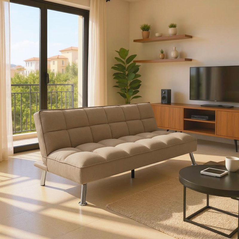 - Φέρει εύχρηστο μεταλλικό μηχανισμό «click-clack» που με μία μόνο κίνηση μετατρέπει τον καναπέ σε κρεβάτι και το αντίστροφο.
