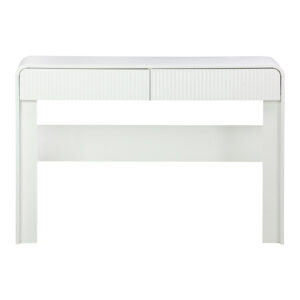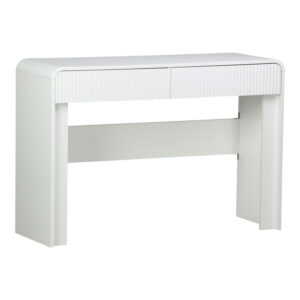 Το κύριο σχεδιαστικό στοιχείο είναι η ανάγλυφη υφή των δύο συρταριών, προσδίδοντας μια νότα luxe και οπτικού ενδιαφέροντος στην κατά τα άλλα μίνιμαλ επιφάνεια. Το λευκό φινίρισμα εξασφαλίζει τη μέγιστη προσαρμοστικότητα σε κάθε χρωματική παλέτα, ενώ τα δύο ευρύχωρα συρτάρια προσφέρουν διακριτική αποθήκευση.