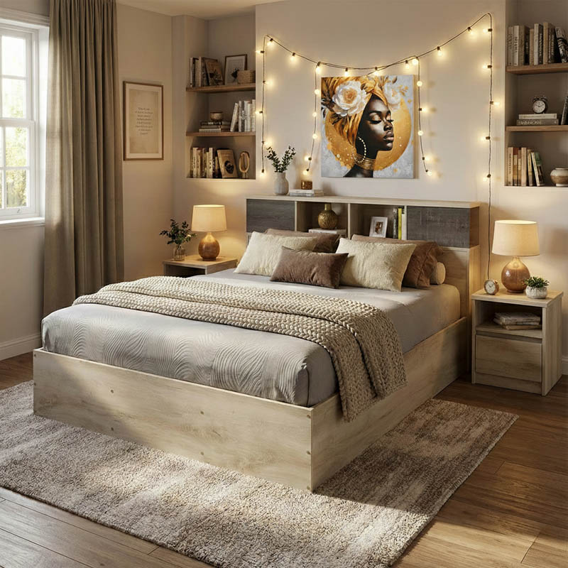 Τα διακοσμητικά μικρά ράφια στο προσκέφαλο και οι κάθετες τάβλες των ποδιών απογειώνουν το συνολικό αισθητικό αποτέλεσμα.