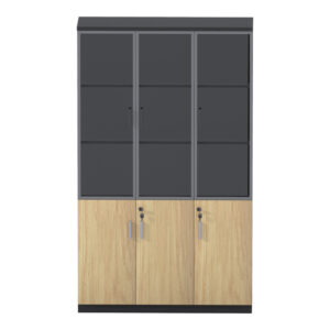 - Κομψός Σχεδιασμός: Ο συνδυασμός του ξύλινου φινιρίσματος με τις γυάλινες πόρτες και τις μεταλλικές λεπτομέρειες προσδίδει ένα μοντέρνο και διαχρονικό στυλ που ταιριάζει σε κάθε γραφείο.