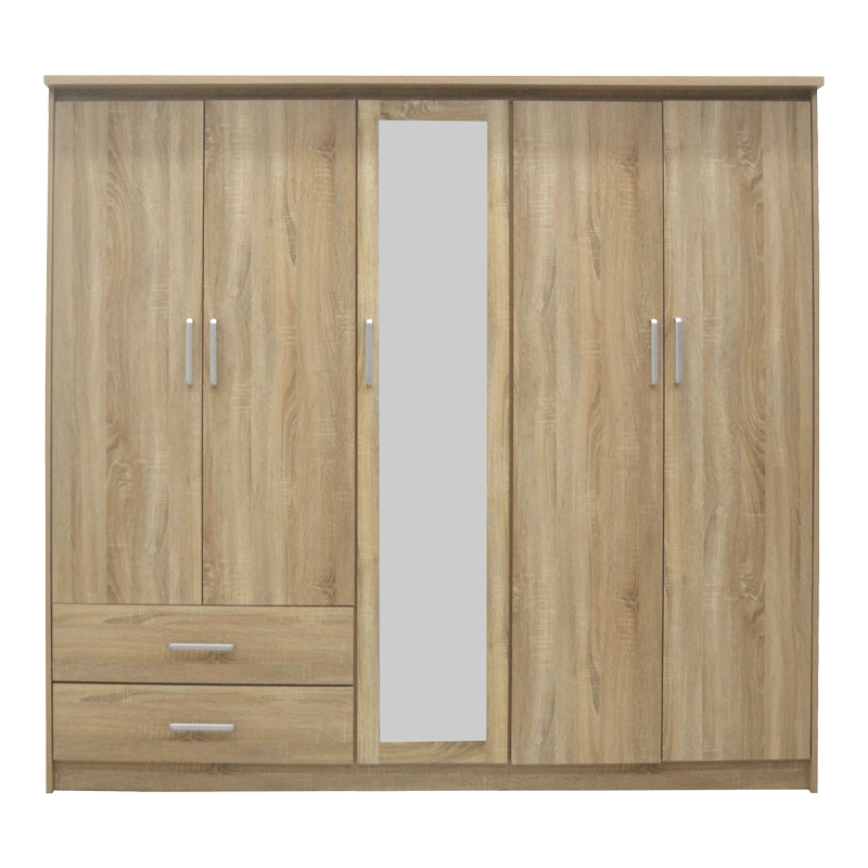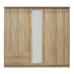 - Περιλαμβάνει δεξιά και αριστερά δύο διπλά φύλλα με εσωτερική ράγα για κρεμάστρες, το ένα κάτω έχει δύο μεγάλα συρόμενα συρτάρια, ενώ το άλλο φέρει εσωτερικό ράφι. Στο κέντρο της σύνθεσης υπάρχει στενή/μονή ντουλάπα με εξωτερικό καθρέφτη και εσωτερικά τρία ράφια. Οι ιδανικοί χώροι για την αποθήκευση ρούχων και αξεσουάρ.