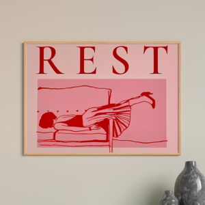 Προσθέστε έναν έντονο και σατιρικό τόνο στον χώρο σας με τον ανατρεπτικό πίνακα Restika. Ο πίνακας αυτός φέρει το μήνυμα “R E S T” (Ξεκούραση) με δραματική, μπορντό γραμματοσειρά πάνω από την απεικόνιση ενός ατόμου που ξεκουράζεται σε μια έντονη ροζ χρωματική παλέτα. Είναι το ιδανικό statement piece για το σαλόνι, το γραφείο ή το υπνοδωμάτιο, που συνδυάζει Pop Art αισθητική με ένα ισχυρό, χιουμοριστικό μήνυμα.