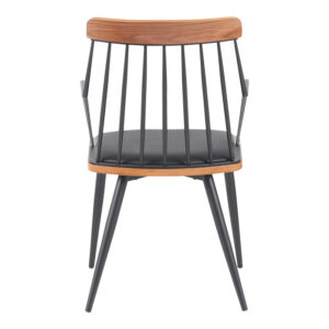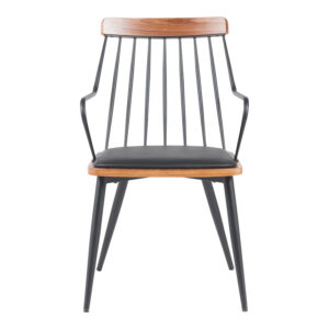 Η πολυθρόνα τραπεζαρίας Posse διακρίνεται για τον εκλεπτυσμένο βιομηχανικό της σχεδιασμό. Διαθέτει ένα άνετο, λεπτό μαξιλάρι καθίσματος , το οποίο πλαισιώνεται από έναν κομψό μεταλλικό σκελετό. Η πλάτη αποτελείται από κάθετες μεταλλικές ράβδους που καταλήγουν σε μια οριζόντια, ξύλινη λεπτομέρεια, προσδίδοντας μια διακριτική αντίθεση. Τα λεπτά, κωνικά μεταλλικά πόδια ενισχύουν την αίσθηση ελαφρότητας και σταθερότητας. Οι καμπύλες μεταλλικές χειρολαβές προσφέρουν επιπλέον άνεση και στυλ.