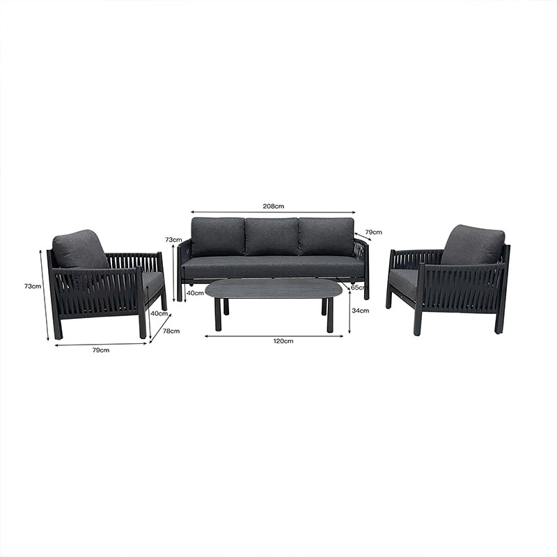 Φέρτε την κομψότητα και την άνεση στον χώρο σας με το εκπληκτικό σετ σαλονιού Feralda. Κατασκευασμένο με γνώμονα την αντοχή στις εξωτερικές συνθήκες, το πλαίσιο από ανθεκτικό υλικό σε συνδυασμό με την πλέξη του πολυεστερικού σχοινιού δίνει μια μοντέρνα και διαχρονική αισθητική. Είτε ψάχνετε για ένα μέρος να χαλαρώσετε με ένα βιβλίο είτε να διασκεδάσετε φίλους και οικογένεια, το Feralda είναι η τέλεια προσθήκη στον κήπο, την βεράντα ή το αίθριό σας.