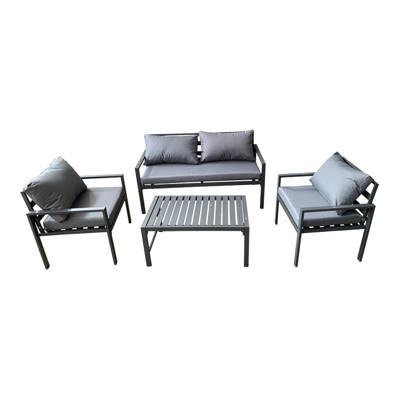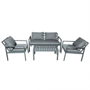 Τα μαλακά γκρι μαξιλάρια προσθέτουν άνεση και φινέτσα, ενώ οι καθαρές γραμμές του σετ το καθιστούν κατάλληλο για κάθε στυλ διακόσμησης. Περιλαμβάνει έναν διθέσιο καναπέ, δύο πολυθρόνες και ένα τραπεζάκι, ιδανικά για στιγμές χαλάρωσης με φίλους ή οικογένεια.
