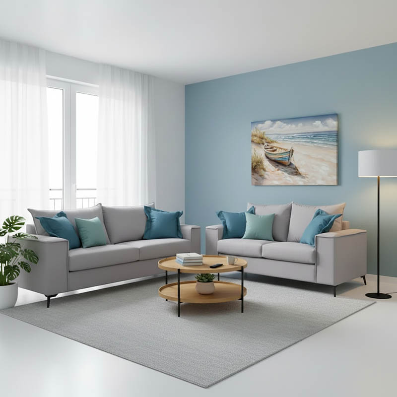 μαξιλαράκια σε μπλε χρώμα στον διθέσιο και δύο στον τριθέσιο καναπέ.