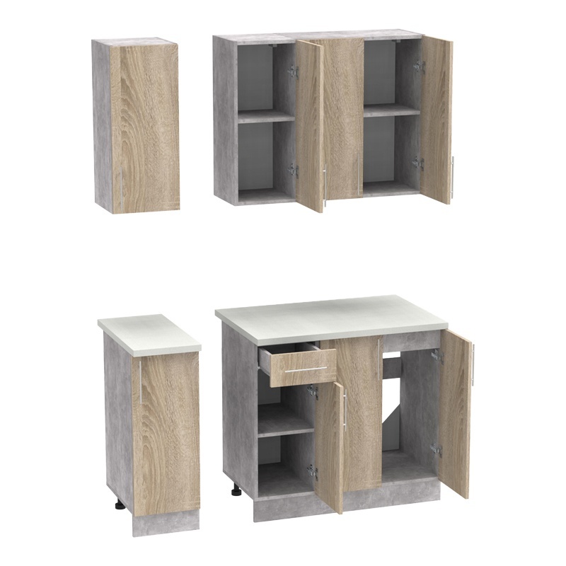 - Κάτω: Ένα διπλό ντουλάπι, ένα μονό και ένα ντουλάπι με συρτάρι