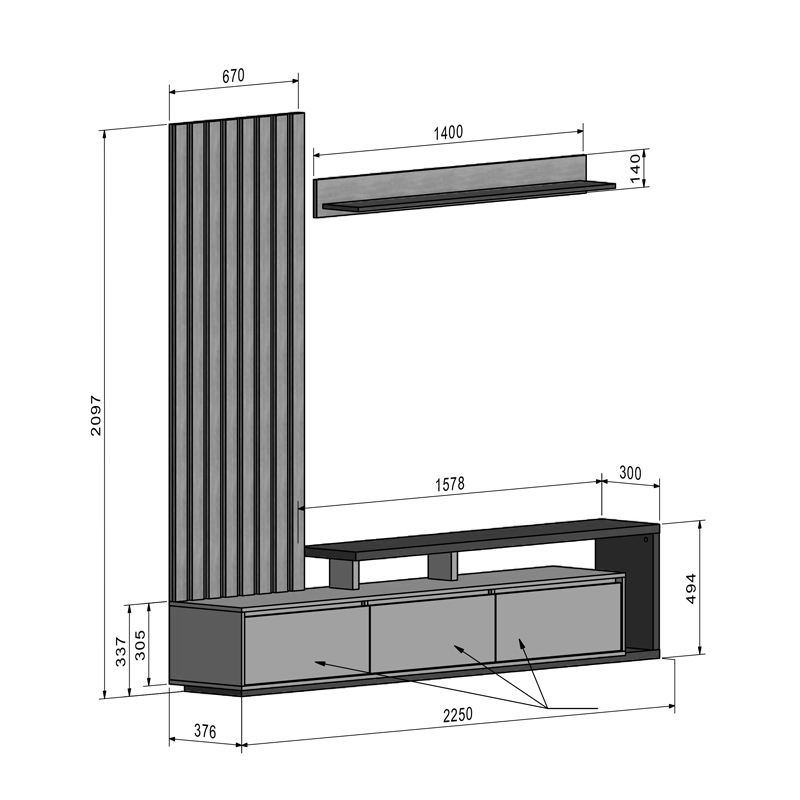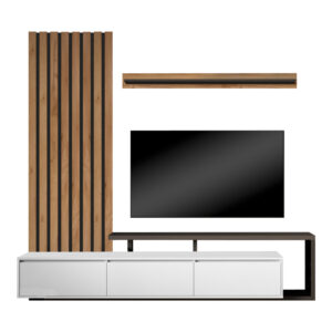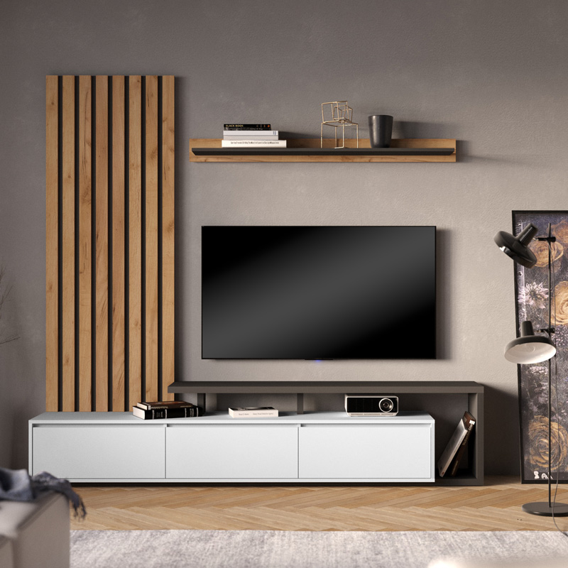 • Φέρει ράφι για τις ηλεκτρονικές συσκευές καθώς και τρία ντουλάπια για την αποθήκευση μικροαντικειμένων.